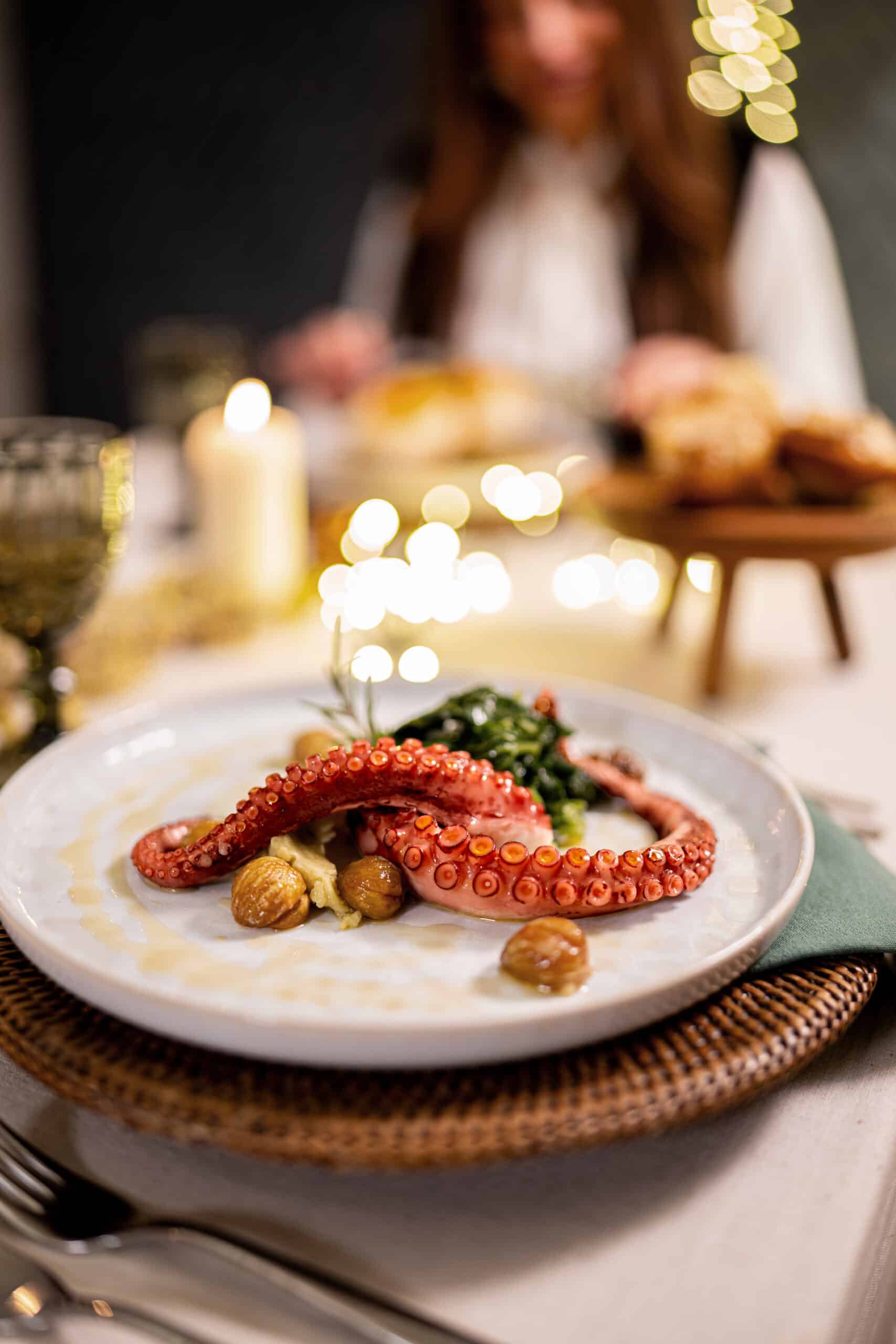 Polvo cozido com puré de batata, grelos e castanhas