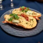 Lamine o queijo e o lombo de bacalhau cura amarela em fatias finas