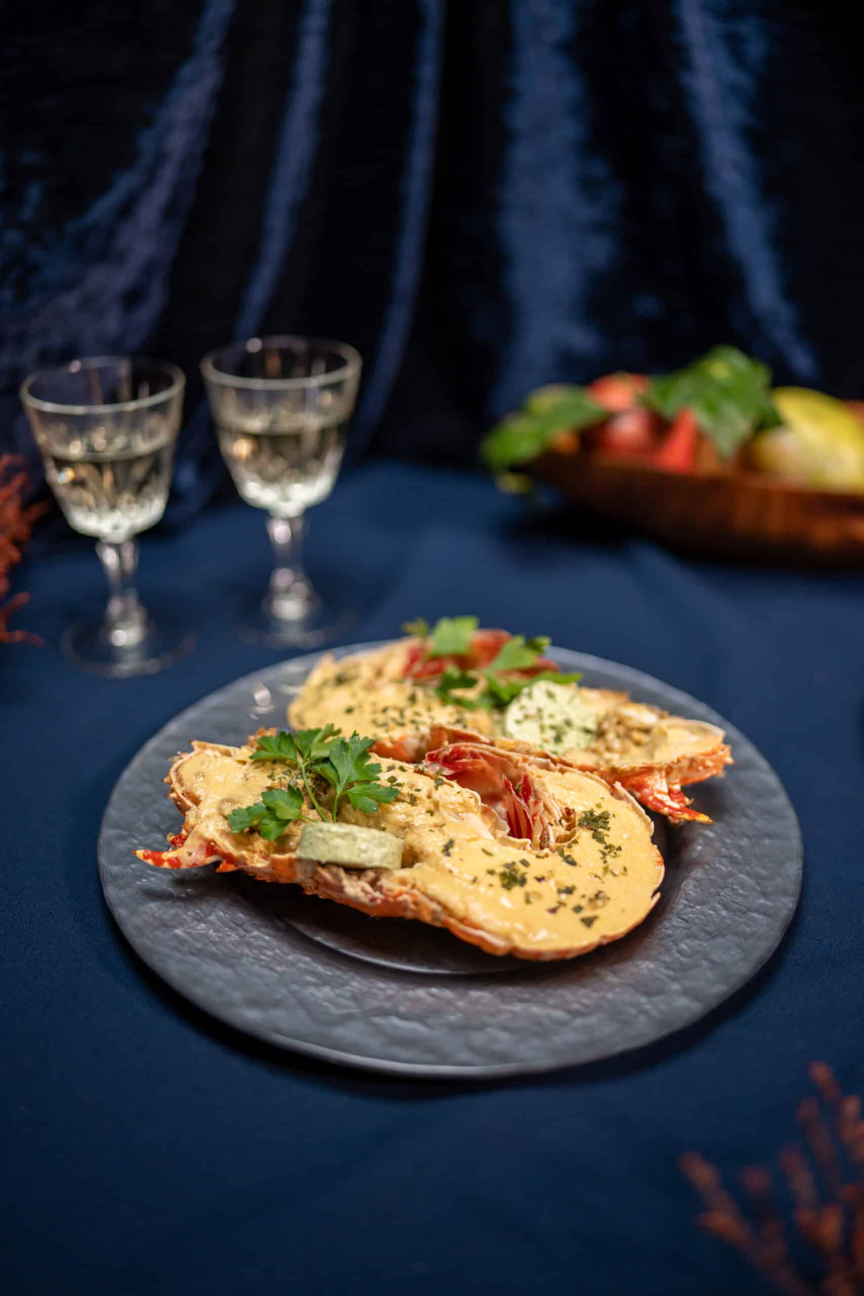 Abra a lagosta ao meio e retire a carne. Pique-a e volte a colocá-la dentro das cascas.
